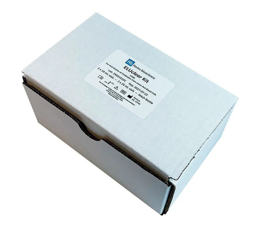 ELUclear is a glycine acid elution kit designed for preparing high-quality eluates for antibody identification. The precisely formulated pH indicator changes color distinctly from yellow to blue at the optimal pH, preventing over-buffering that can dilute antibodies below the limit of detection (LOD). The kit includes a wash bottle with a calibrated fill line for easy wash solution preparation and ready-to-use, color-coded vials for added convenience.